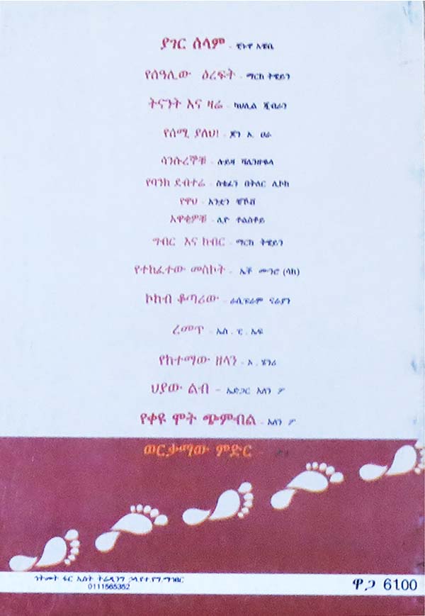 ያገር ሰላም - ቺኑዋ አቼቤየሰዓሊው ዕረፍት - ማርክ ትዌይንትናንት እና ዛሬ - ካህሊል ጂብራንየሰሚ ያለህ! - ጆን ኦ. ሀራሳንሱረኞቹ - ሎይዛ ቫሌንዙዬላየባንክ ደብተሬ - ስቴፈን በትለር ሊኮክየዋህ - አንቷን ቼኾቭአዋቂዎቹ - ሊዮ ቶልስቶይግብር እና ክብር - ማርክ ትዌይንየተከፈተው መስኮት - ኤች ሙንሮ(ላከ)ኮከብ ቆጣሪው - ራሲፑራም ናራያንረመጥ - ኤስ. ፒ. ኤፍየከተማው ዘላን - ኦ. ሄንሪህያው ልብ - ኤድጋር አለን ፓየቀዩ ሞት ጭምብል - አለን ፓወርቃማው ምድር - ፓ